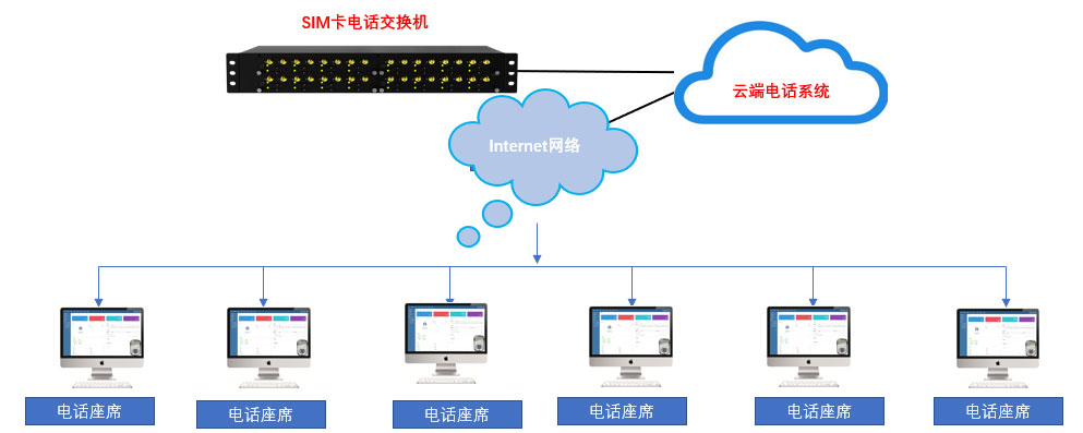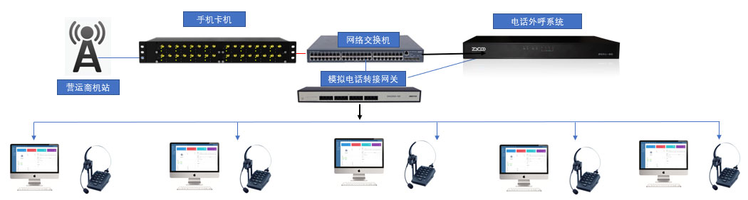 上图是一个外线以手机卡+呼叫中心系统+IAD语音网关 +模拟电话机方案图示