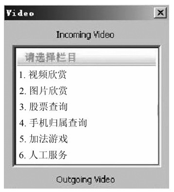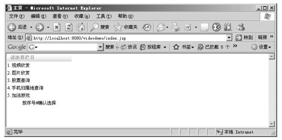 当VXML文档经过VXML解析器进行解析后,得到URL,此处为http://192.168.2.89:8080/testVXML/index.jsp,然后将该URL提供给MBD,MBD将相应网页进行截图,最后合成.mov文件。视频显示效果如下图所示: