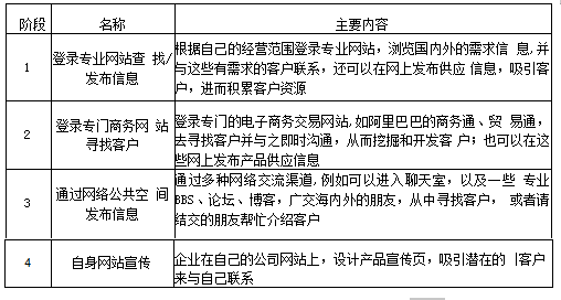 网络寻找法指借助互联网宣传、介绍自己的产品从而寻找客户的方法。随着上网人数的日渐增多,企业很容易在网络上找到客户,因此该方法前景广阔,其实施方式如表3-6所示。