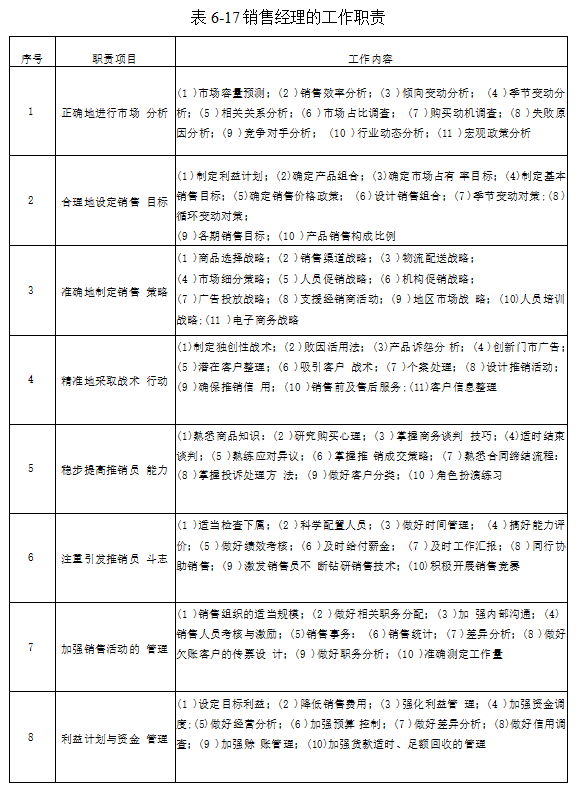 销售经理作为一个职能部门的管理者,从管理学的意义上来 说,其根本职责就是对整个公司的销售队伍进行规划、组织、指挥、控制、协调和激励。销售经理主要是通过管理销售队伍来完 成销售任务的。销售经理的职责可以具体总结为表6-17所示的 几个方面。