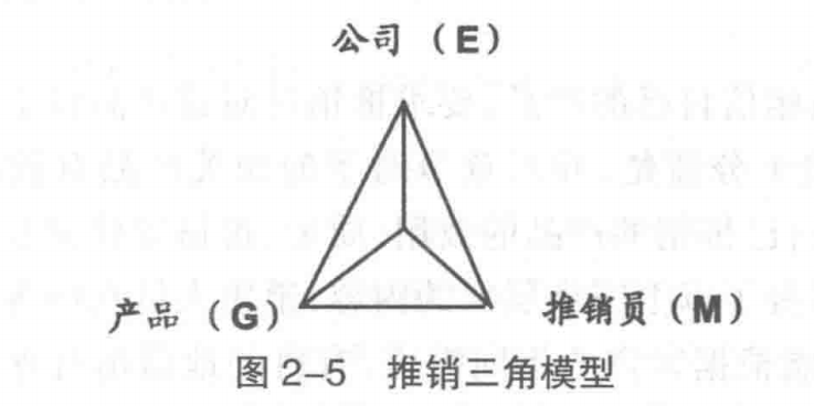 推销三角模型认为:推销成交的实现,是推销人员、企业、推 销品三个因素综合作用的结果,其目的是旨在帮助培养推销人 员的自信心,提高说服能力。推销三角模型的结构如图2-5所 示,在有的著作中它也被称为吉姆模式。吉姆是英文单词产品 (Goods )、企业(Enterprise )、推销人员(Man,也有的书上说是 Myself)的首字母组合GEM的译音。