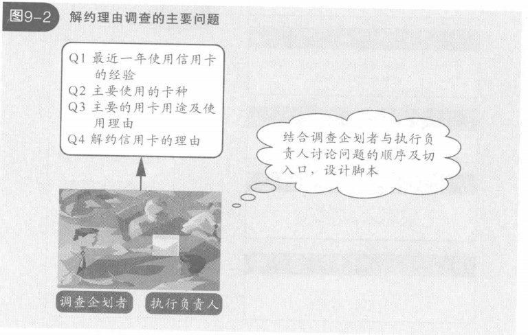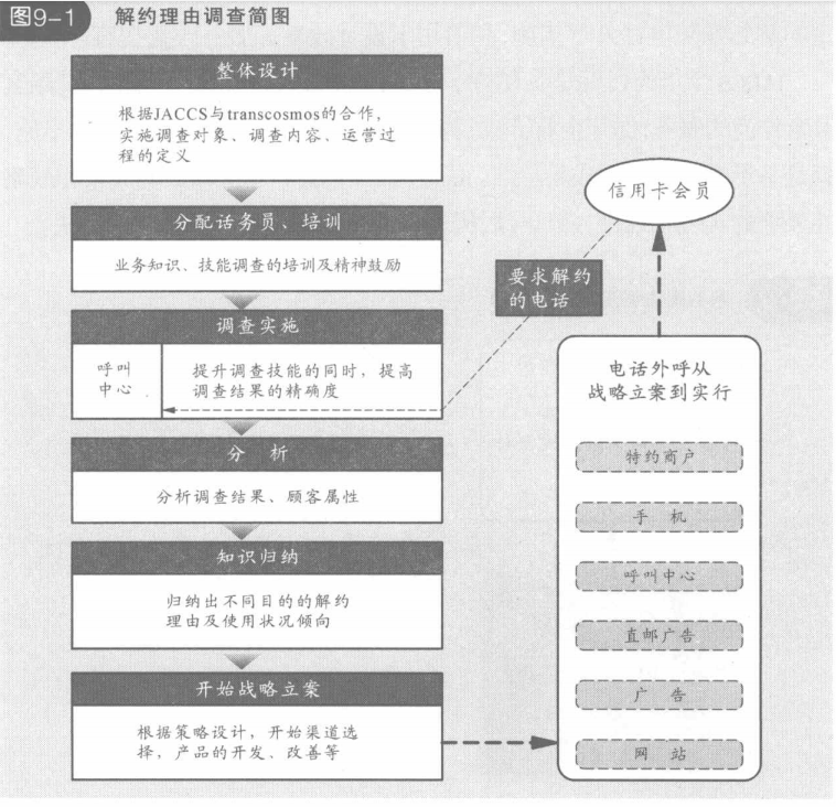 这次项目的目的不但是充分利用JACCS的呼叫中心这个已有的途径,收集、分析打算解约的顾客的真实想法,减少信用卡的解约数,还要挖掘新客户,提高满意度(见图9-1)因此在调查当中,必须设定可以准确地询问出决定信用卡使用或者解约的因素,对顾客的真实意见进行菜度分析。项目成员在考虑调查手段及呼叫中心实际调查时的各种制约条件的同时,进行慎重的调查设计(见图9-2)。比如,为了不给顾客造成心理1的负担,不会贸然询问为什么解约,而是逐渐建立与顾客的信赖关系,分阶段询问顾客信用卡使用的实际情况,在问题的JI醇和表达技巧上下工夫。通过这样一番努力,顾客对调查的配合率达到了约九成,同时,在一般化的解约理由的调查中无法询问出的主要卡种及信用卡使用的决定因素,在此次调查中也询问出来了。