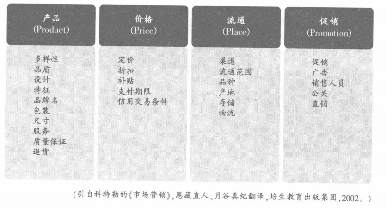 理念明晰后,再决定市场营销组合,制定出具体的市场营销计划。所谓市场营销组合是指整合概念后得出的4P——产品(Product)、价格(Price)、渠道(Place)、推广(Promotion)的组合,从而产生相乘效果。