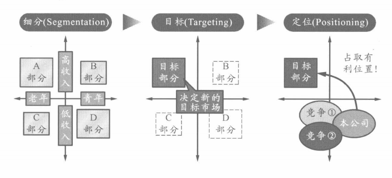 战略方向定下来之后,就可以确定谁,有哪些需要,针对这些需要应该发布哪些信息等这些最基础的内容。这个时候,最有效的方法是STPo即把市场细分成若干个部分(Segmentation),制定出有针对性的市场目标及对应的详细可行的目标细节(Targeting),然后决定企业或商品的形象、设计等,使其能够在目标客户心目中获得独特的位置(Positioning)。