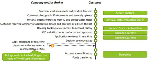 在这个例子中,我们可以看到智能RPA,以及围绕它构建的一些巧妙放置的AI工具,是如何帮助重新设计和简化客户旅程的。
