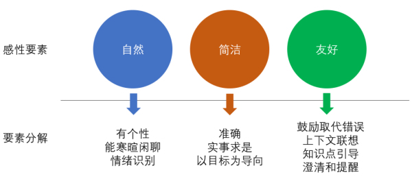 对话交互产品化的本质,是主动通过标准化产品手段让机器人达到对话交互智能。对于用户来说,核心体验集中在与客服机器人的对话交互上;根据我们经验,我们将交互智能列为如下三个感性要素:
