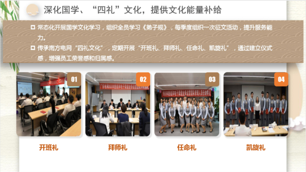 同时我们也在思考,对年轻人要有责任感。因为来到我们团队中95后占了50%,我们这里的工作是他们毕业后的第一份职业。将来,他们当中一部分人可能会走向其他不同的社会岗位,因此我们要更加用心地培养这些年轻人,帮助他们树立正确的价值观和人生观,教育他们做人要立品、懂礼,这也是我们对社会的一种责任。我们开展了学习《弟子规》的国学课程,并将思礼文化融入他们的工作当中,开办开班礼、拜师礼、任命礼、凯旋礼,帮助我们年轻员工成为品德优异的人。另外,所谓三人行必有我师,我们鼓励年轻人相互学习,以工友为师,以先进的标杆为师,以问题为师,打造三师文化。