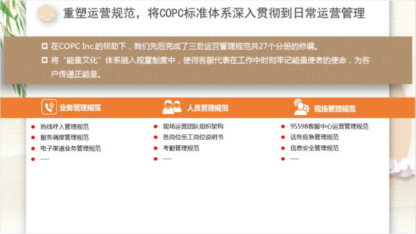 在我们搭建能量价值体系的时候,正好我们也在做COPC认证,所以在COPC的帮助下,我们把现场所有的运营行为进行了规范和完善,将能量文化融入到制度中,让我们的客服代表时刻记住我们的使命。