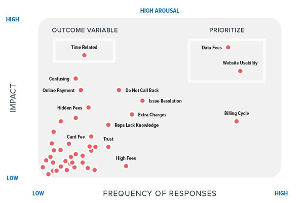 一个问题的概念加上一个开放式评论可追溯到引入净推荐者分数。问题是企业需要知道需要采取什么行动,这通常意味着增加更多问题。相比之下,Decooda的方法使用高级分析来解码提交给I.Q.问题的文本的含义,以揭示关键问题和影响。该图表说明有时频率较高的问题不一定是行动的首要任务。