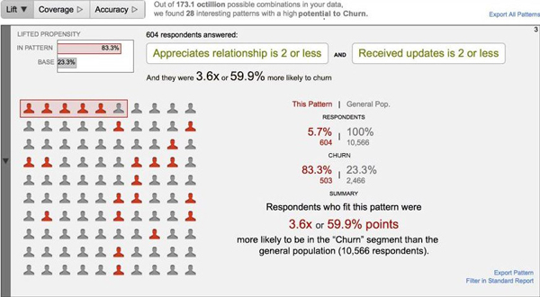 此外,Sinoway表示,许多MaritzCX客户正在整合VoC和运营数据。以下是Spotlight®DataMining的报告示例,该报告可以分析来自调查,上传文件以及与CRM和其他企业系统集成的数据,以帮助识别面临流失风险的客户。