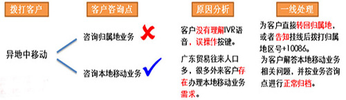 经过外呼调研和客户的录音分析,客户咨询归属地业务的原因主要为没有理解IVR语音从而导致误操作引发的,具体可以见下图。