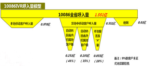 根据2013年的服务数据分析,客户在漫游中拨打10086的服务量(如北京的客户去深圳拨打10086)达0.551亿/月,占10086整体呼入量(1.551亿)的36%。而在这0.551亿次呼叫中自动转回归属地客户占比为81%,选择进入本地服务的客户仅有10%,而9%的客户在未选择前就挂线了。