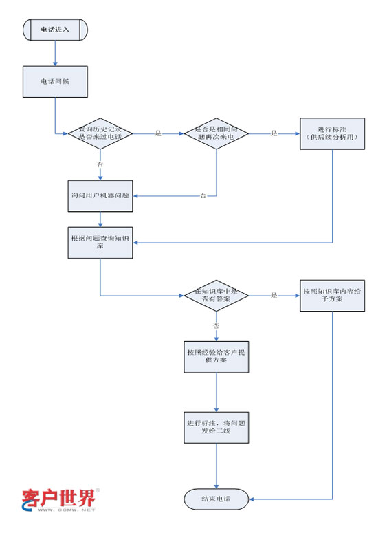 上述的流程图描述得比较详尽,对于客户电话接入后问题咨询,CSR应该首先进行问题确认,如果之前曾有过同类问题,则应该在信息记录中进行标注,这样做的目的是为了能将重复来电的问题进行归类,此后流程要求CSR应该查询知识库进行回答,如果确认知识库中没有该问题答案,才能根据自己的经验进行方案提供,但是也需要进行标注,发给二线也就是后台支持人员进行知识库内容的添加。从流程设计上看,基本上可以满足将重复问题筛选出来的目的。