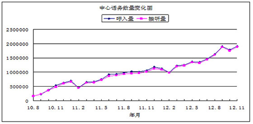 自2010年8月至2012年11月,中心话务数量呈稳步上升趋势,其中同季度内呼入量最高点分别为:2011年1月到达6.9万多通;2011年12月到达11.7万余通;2012年11月到达19.1万通。具体变化如下图所示: