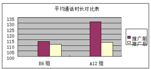 根据2012年1月至3月接听电话数量的数据,结合每组的实际情况,最终选定了成绩一般的B6组和A12组为推广小组,B6组为工作两年以上的老座席组,三个月的组内平均通话时长为113.62秒,中心老座席组平均通话时长为109秒;组内平均接听电话数量为105通,老座席组的平均接通电话数量为114.2通,B6组在老座席组中排名靠后;A12组为新员工组,三个月的组内平均通话时长为131.19秒 ,新员工的平均水平为121秒;组内平均接听电话数量为102.6通,新员工的平均水平为109.2通,A12组在新员工中排名靠后,2012年4月份,中心将优化后业务操作流程在B6组和A12组推广,并集中采集两个小组5月份的数据进行汇总分析。