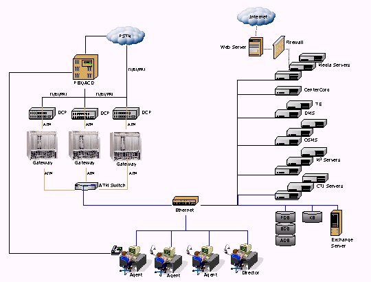 DCP-Gateway Combo Gateway安装有语音资源卡、会议电话卡、VoIP卡、ATM卡等相关硬件,实现呼叫中心语音功能,主要包括语音交换、语音资源分配、会议电话、电话转接、录音、监听、语音信箱、IVR语音播报、音乐播放、语音编解码等功能。 DCP与Gateway协同工作,共同实现呼叫中心语音功能,其间通过ATM的链路实现高速、稳定的语音通道互传,另外一条以态网链路实现了Gateway对DCP的控制。 ATM Switch EnsemblePro服务器群