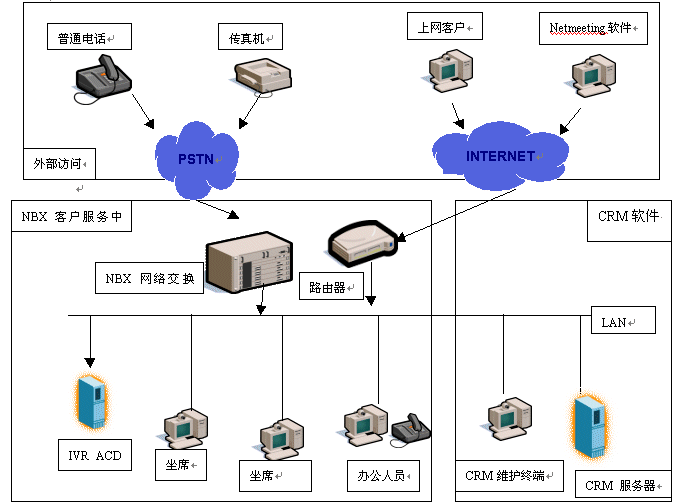 NBX客户服务中心是基于3Com公司的NBX网络电话交换机平台构筑的新一代呼叫中心,首先它扩大了服务方式,客户不但可以通过电话得到服务,还可以在上网访问企业主页的同时使用耳机、麦克风直接与服务代理人员(AGENT)语音通话,一边浏览网页,一边交谈,增加交流的信息辅助量。还可以通过电子邮件、传真等方式完成与企业信息交流,其次NBX客户服务中心内部数据、语音两网合一的布线结构,不但提高了呼叫中心的稳定性,而且使客户数据能与电话语音同步协调,完成具有针对性的一对一的客户服务。