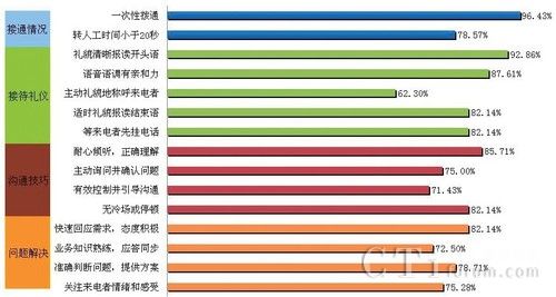 就热线服务四个环节(接通情况、接待礼仪、沟通技巧和问题解决)的监测结果看,接通情况表现较为良好,一次性拨通指标平均实现率为96.43%,情况较为乐观。但在转人工时间<20秒的指标上,不是太理想,平均实现率仅为78.57%。