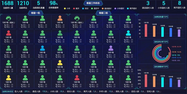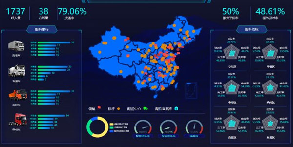 在运营管理上实现对客服指标、服务类型数据、服务站服务数据等的大屏可视化监控,数据动态更新,并对客服座席状态、服务指标、服务排行等进行秒级刷新的实时可视化监控,实时辅助决策。