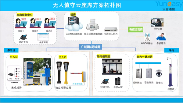 1)云翌停车场无人值守云座席方案,通过在机房部署一套云座席系统,连接到局域网和广域网,满足各职能部门的沟通调度协作要求;