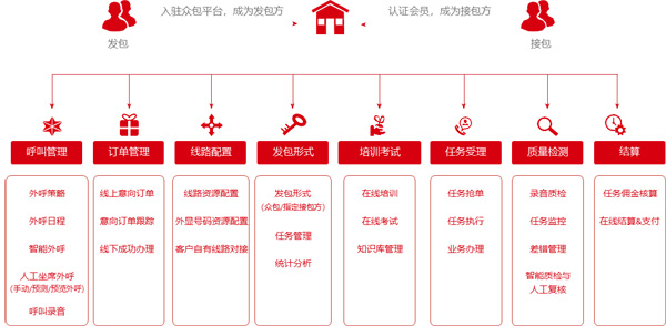 众包是中国东信打造的互联网化的呼叫中心平台,平台采用互联网众包模式,上游有呼叫业务需求的企业客户可以在众包平台上发布任务,同时,平台接入了分布在全国的大量的下游呼叫中心服务商,服务商负责组织海量的呼叫坐席在平台上进行抢单作业。通过众包模式,平台实现了呼叫中心行业的集约化管理,并能够有效的调用全国的外呼生产力,极大的提升了整个行业的服务效率。同时,平台的一站式统一管理,为上下游企业客户提供了各种自动化的管理工具和智能化的服务工具,减轻了企业客户的业务管理负担,能够为广大企业用户实现了提效降本的目标。