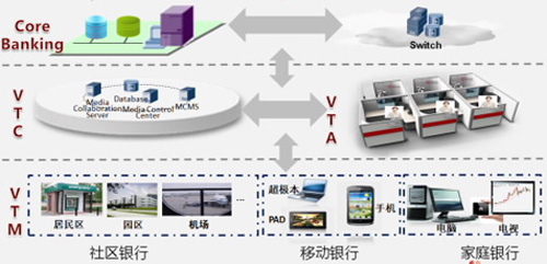 2011年9月在中国北京国际金融展上,华为创新性的推出VTM远程银行解决方案。应用华为全套高清视频、远程协作、业务推送、路由排队技术,提供远程银行应用的VTM通信解决方案,实现远程柜台服务。远程柜员通过高清视频和协作的技术向客户提供面对面服务,全面提升客户服务体验。