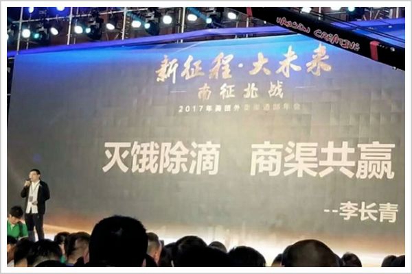 在美团外卖渠道部2017年年会上,一句“灭饿除滴,商渠共赢”的口号赫然而出,杀气跃然纸上。