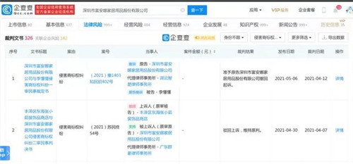 企查查显示,富安娜曾涉司法案件高达638起,其中以侵害商标权纠纷,占326起,接近半数。5月13日富安娜新增3则开庭公告,3起案件中2起案件案由系商标权权属、侵权纠纷,其余1起案件案由不详。2起商标权权属、侵权纠纷案原告为富安娜,被告为徐某、海门市丹娜纺织品加工厂。