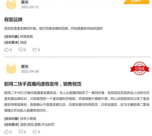 线上快速铺开的销售渠道,相应的监督管理似乎没有跟上,富安娜线上销售的产品,投诉量反而增加。投诉中,有不少投诉涉及快手、抖音等短视频平台售假。例如,有匿名用户在黑猫投诉上表示,在貂得二手直播平台上,购买的富安娜产品为假货。“4月1日晚间直播富安娜床品,本人从直播间购买了一套四件套,收到货后发现床品上没有任何富安娜品牌标识,只有随带的一个富安娜的手提袋,手提袋图片模糊不清,担心买到假货所以找了富安娜官网客服复检,客服确认不是富安娜正品,且富安娜没有授权店,只有加盟店。”