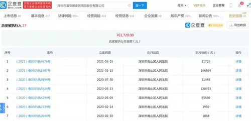 裁判文书的统计分析显示,富安娜涉及案件总金额为4883.84万元,其中富安娜身份为被告的涉案金额为4577.66万元,占比达93.73%。同时,富安娜历史被执行人17次,执行金额共计76.2万元。