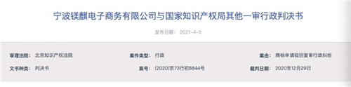 4月5日,北京法院审判信息网显示,“口红一哥”李佳琦持股49%的宁波镁麒电子商务有限公司与国家知识产权局其他一审行政判决书公布,原告为宁波镁麒电子商务有限公司,被告为国家知识产权局,案由为商标申请驳回复审行政纠纷。案号为(2020)京73行初8844号,审理法院为北京知识产权法院。
