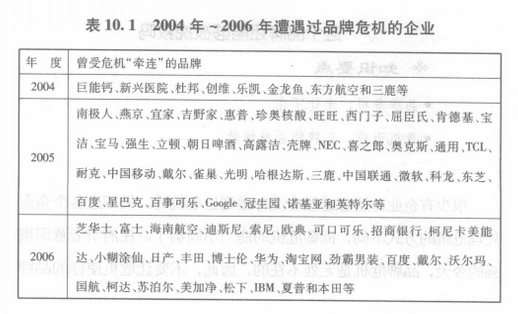 我们几乎每天都能听到各种各样品牌遇到危机的故事,其中不乏大品牌,甚至国际品牌。我们在以上所列举的只是冰山之一角。根据《中国名牌》杂志品牌检测中心的统计研究,近几年来,品牌危机事件进入“高发期”,并对其进行了跟踪和检测,表10.1是2004年-2006年之间,曾经遭遇过品牌危机的企业。