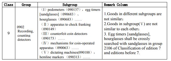 根据分类,原则上假定同一组中的商品或服务彼此相似。如果同一组中的商品或服务不完全相似,则将有子组。原则上,假定同一子组中的商品或服务彼此相似。原则上假定不同子组中的商品或服务彼此不同。但是仍然有一些特殊情况,例如同一子组中的商品不相似或不同子组中的商品彼此相似。所有这些特殊情况都在备注栏中指出。这是一个示例供参考。因此,关于第一个问题,同一相似组中的商品不一定彼此相似。应根据“分类”及其备注栏做出准确的判断。