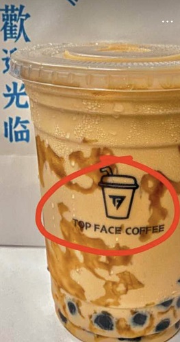 可以看到,奶茶杯上的logo跟TFBOYS有些区别,TFBOYS的倒三角是实线,有线条感,而这个倒三角是实心加粗的,另外,奶茶店在倒三角的基础上还加了一个杯子形状在外面,图案更复杂一点。但不可否认,中间的倒三角图案一模一样。