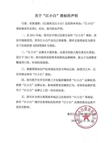 对此,重庆江小白酒业有限公司发表了官方声明《关于“江小白”商标的声明》: