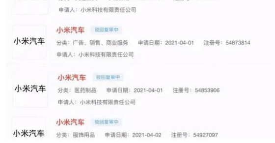 2021年4月,小米集中申请共79个小米汽车相关商标,商标国际分类包含运输工具、广告销售等。近日,多个小米汽车商标状态变更为驳回复审中,在被驳回的商标中,包括了汽车这一项目。