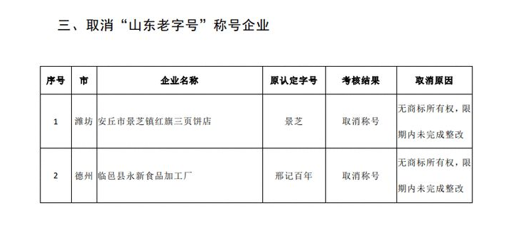 整改结果显示:此前因商标权属问题等原因要求限期整改的13家企业中,7家企业整改合格(3家企业的单位名称发生变更);4家企业因商标权属不清晰、列入失信名单等原因,继续整改;值得注意的是,来自潍坊和德州的两家企业因无商标所有权,被取消“山东老字号”称号。
