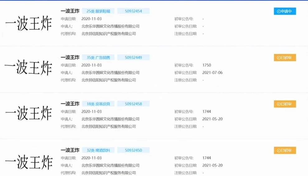 ,近日,乐华娱乐申请注册的多个“一波王炸”商标状态变更为“商标已注册”,国际分类涉及陪酒饮料、办公用品、乐器等。