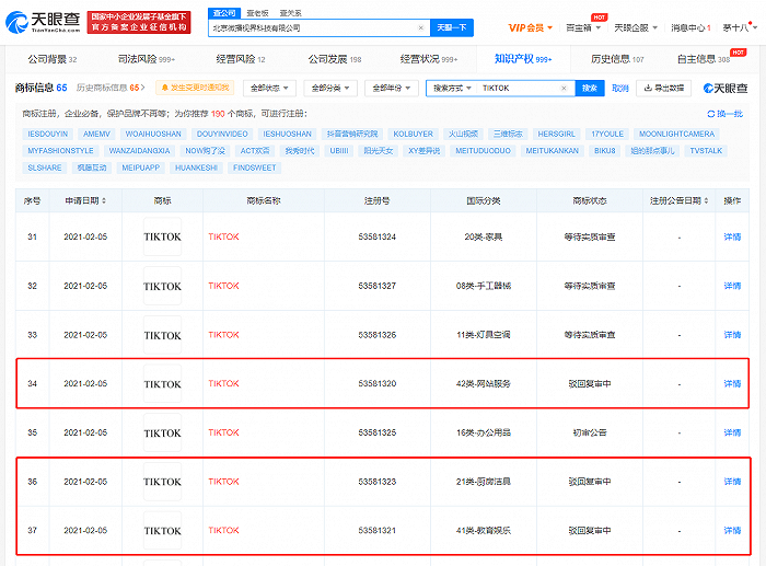 据天眼查App显示,近日,抖音运营主体北京微播视界科技有限公司申请注册的“TIKTOK”部分商标状态变更为“驳回复审中”,国际分类涉及网站服务、教育娱乐、厨房洁具等。值得一提的是,目前该公司已提交超60个“TIKTOK”相关商标申请注册信息。据悉,TIKTOK为抖音海外版名称。