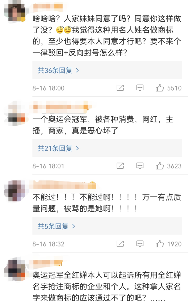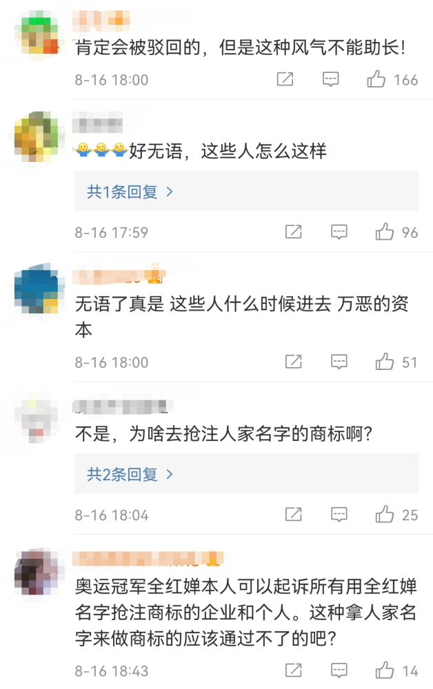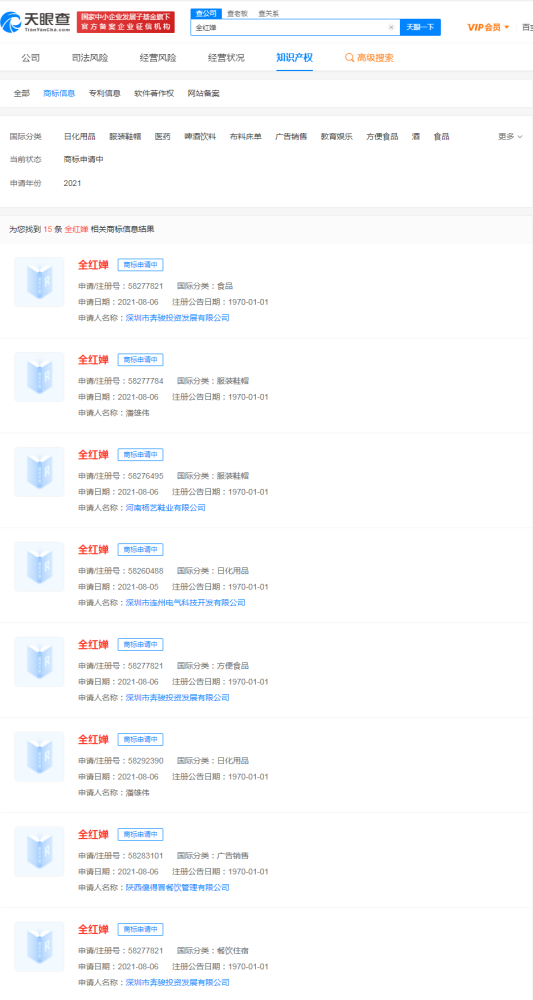 天眼查App显示,近日,东京奥运会女子单人10米跳水冠军“全红婵”被抢注商标,国际分类涉及食品、服装鞋帽、日化用品等,申请人包括深圳市奔骏投资发展有限公司、潘雄伟等,目前商标状态均为申请中。