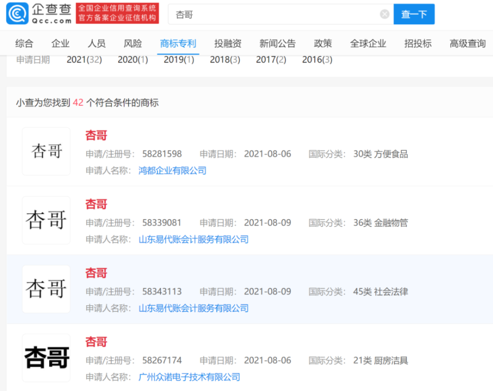 在全红婵的名字被抢注商标前,全红婵的爱称“杏哥”就已经历了一轮商标抢注战。
