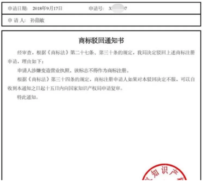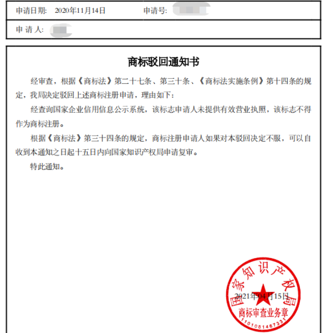 审查员检索了该申请人申请商标时提供的个体户执照,国家企业信用信息公示系统搜索不到任何信息。最终,该商标申请均以“申请人涉嫌变造营业执照,该标志不得作为商标注册”为由,适用《商标法》第二十七条、第三十条予以驳回。