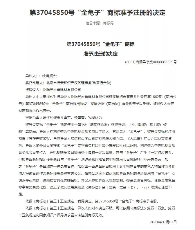 2019年底,备受关注的“金龟子”商标无效案尘埃落定。北京市高级人民法院二审认定“金龟子”系第三人刘纯燕的艺名,其亦享有在先姓名权,同时,因刘纯燕主持的少儿类节目多为寓教于乐性质的节目,与诉争商标第13029596号“金龟子”核定使用的“教育、培训”等服务在服务的目的、内容、方式、对象等方面存在较大重合和关联性,认定李某注册“金龟子”商标的行为侵犯了刘纯燕的在先权利,判决驳回李某的上诉请求,维持北京知识产权法院作出的争议商标“金龟子”予以撤销的判决。近日,从商标官网了解到第37045850号“金龟子”商标核定在“墙砖粘合剂;粘胶纤维;工业用明胶;氯丁胶;硅酮”等商品与“金龟子”刘纯燕赖以知名的电视娱乐节目等服务行业差异显著,加之“金龟子”是自然界一种昆虫名称,如仅因一普通名词曾被用于某电视栏目中的角色人物名称而禁止他人将该名词作为商标使用显然有失公允。相关公众应不致认为被异议商标的注册使用与“金龟子”刘纯燕存在关联,进而损害其在先姓名权。遂决定:第37045850号“金龟子”商标准予注册。