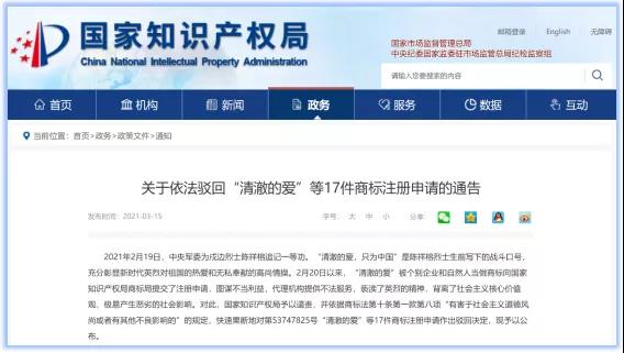 3月15日,国家知识产权局发布通告,依据商标法第十条第一款第(八)项“有害于社会主义道德风尚或者有其他不良影响的”的规定,对“清澈的爱”等17件商标注册申请作出驳回决定。