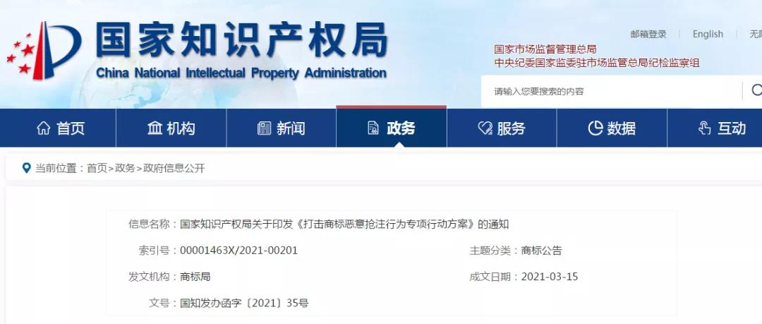 国家知识产权局关于印发《打击商标恶意抢注行为专项行动方案》的通知
