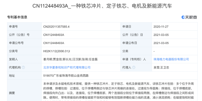 珠海格力电器股份有限公司公开了一项名为“一种铁芯冲片、定子铁芯、电机及新能源汽车”的专利。该专利摘要显示,本申请涉及永磁电机技术领域,主要提供一种铁芯冲片、定子铁芯、电机及新能源汽车。