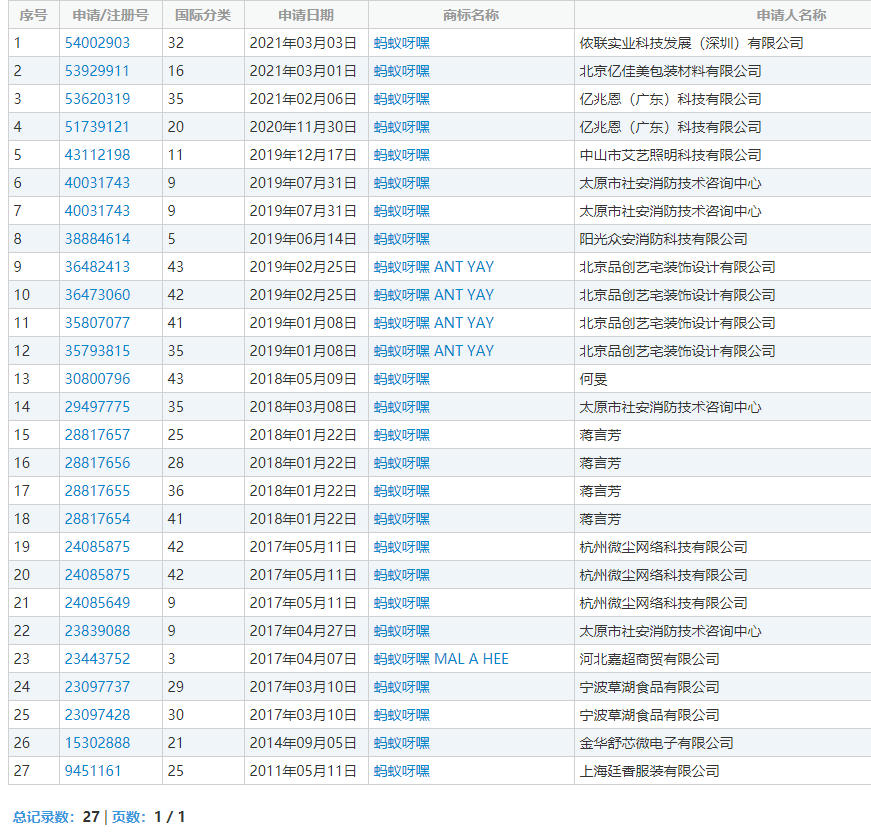从 2 月 6 号至今,“蚂蚁呀嘿”商标已被十几家企业及个人申请注册,国际分类涉办公用品、广告销售、啤酒饮料等。商标状态为 “注册申请中” 此外,蚂蚁呀黑,蚂蚁牙黑等商标也被申请注册。