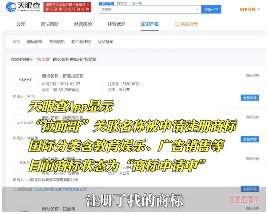 3月4日,网上爆料出天眼查一批显示拉面哥关联名称已被申请注册商标,现在的拉面哥就像一个随时被列举的流量机器,什么人不想来测一把,虽然抢注商标或许会带来利,但他们蹭热度走捷径的注册商标方式实在是太太难看,这种想法行为是否符合商标法申请要求,有没有侵犯拉面哥的权益?也需要接受法律拷问,退一步来说,哪怕不违法,如此恶劣的蹭热度,你们的脸皮真不会红嘛。