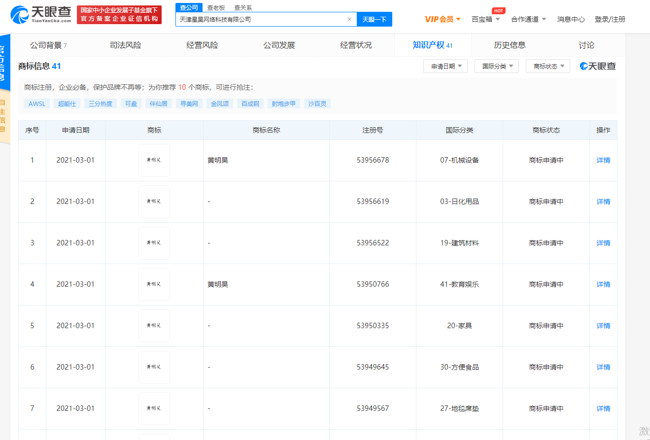 天眼查APP显示,天津星昊网络科技有限公司于3月1日申请注册黄明昊商标,共33条,国际分类包含机械设备、教育娱乐、方便食品等,目前商标状态为“商标申请中”。