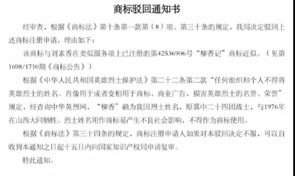 近日,从网络上看到一个报道,广西柳州的李先生所在单位桂留香公司委托某代理机构申请注册的商标“柳香”,在接到申请受理通知书四个月后,被国家知识产权局以“与烈士姓名同名易产生不良影响”的理由驳回。